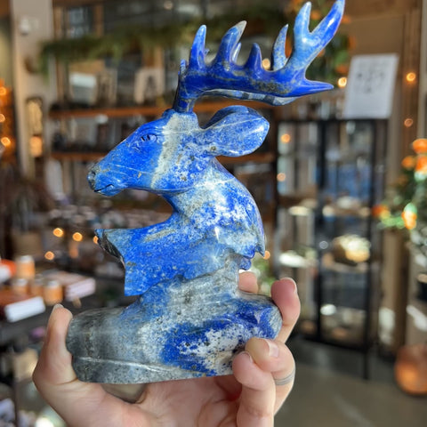 Breathtaking hand-carved, old stock Lapis Lazuli deer bust.