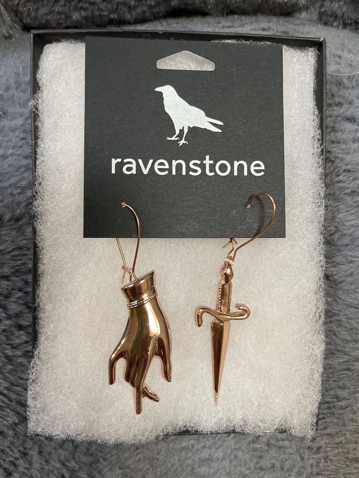 Recycled brass (hand) and hand-poured pewter (dagger) finished with shiny, genuine rose gold and suspended on secure "kidney" style ear wires.