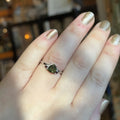 Faceted Moldavite with two small faceted Czech Garnets on either side set in Sterling Silver. Moldavite can be found in a range of light to dark green; some stones are lighter or darker than others. You will receive the exact ring pictured.
