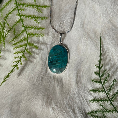 Genuine Azurite and Chrysocolla set in sterling silver on an 18" stainless steel chain.