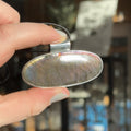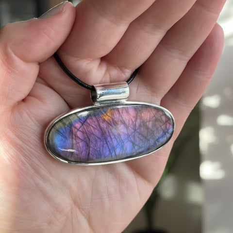 Gorgeous, high-grade statement Sunset Labradorite pendant necklace. A rare version of Labradorite, Sunset Labradorite contains purple, pink, and gold flashes reminiscent of a tropical sunset.