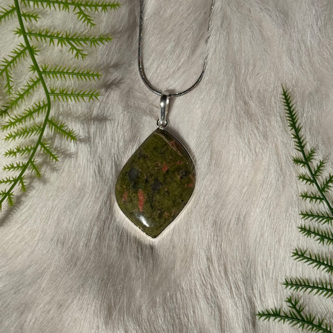 Genuine Unakite set in sterling silver on an 18" stainless steel chain.