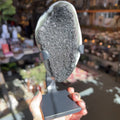 Stunning, high-grade Amethyst on a black metal stand.