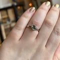 Faceted square Moldavite set in Sterling Silver prongs. Moldavite can be found in a range of light to dark green; some stones are lighter or darker than others. You will receive the exact ring pictured.