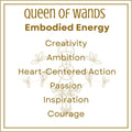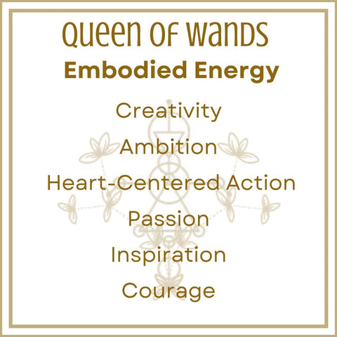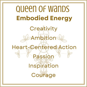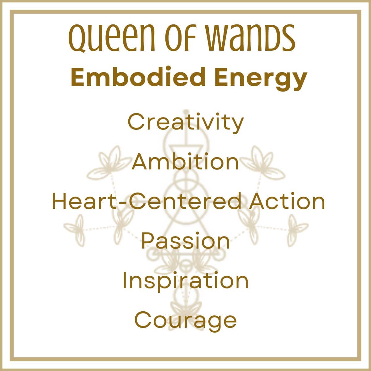 The Queen of Wands carries deep passionate and creative energy, inviting you to embrace and integrate all parts of yourself, even that which you perceive as “negative” or “shadow.” She encourages you to step back into your own power and be the most authentic version of you- A boundless, abundant embodiment of Love.