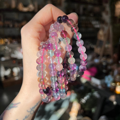 Genuine polished Rainbow Fluorite stretch bracelet. Listing is for one (1) single-strand bracelet. One size fits most.