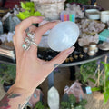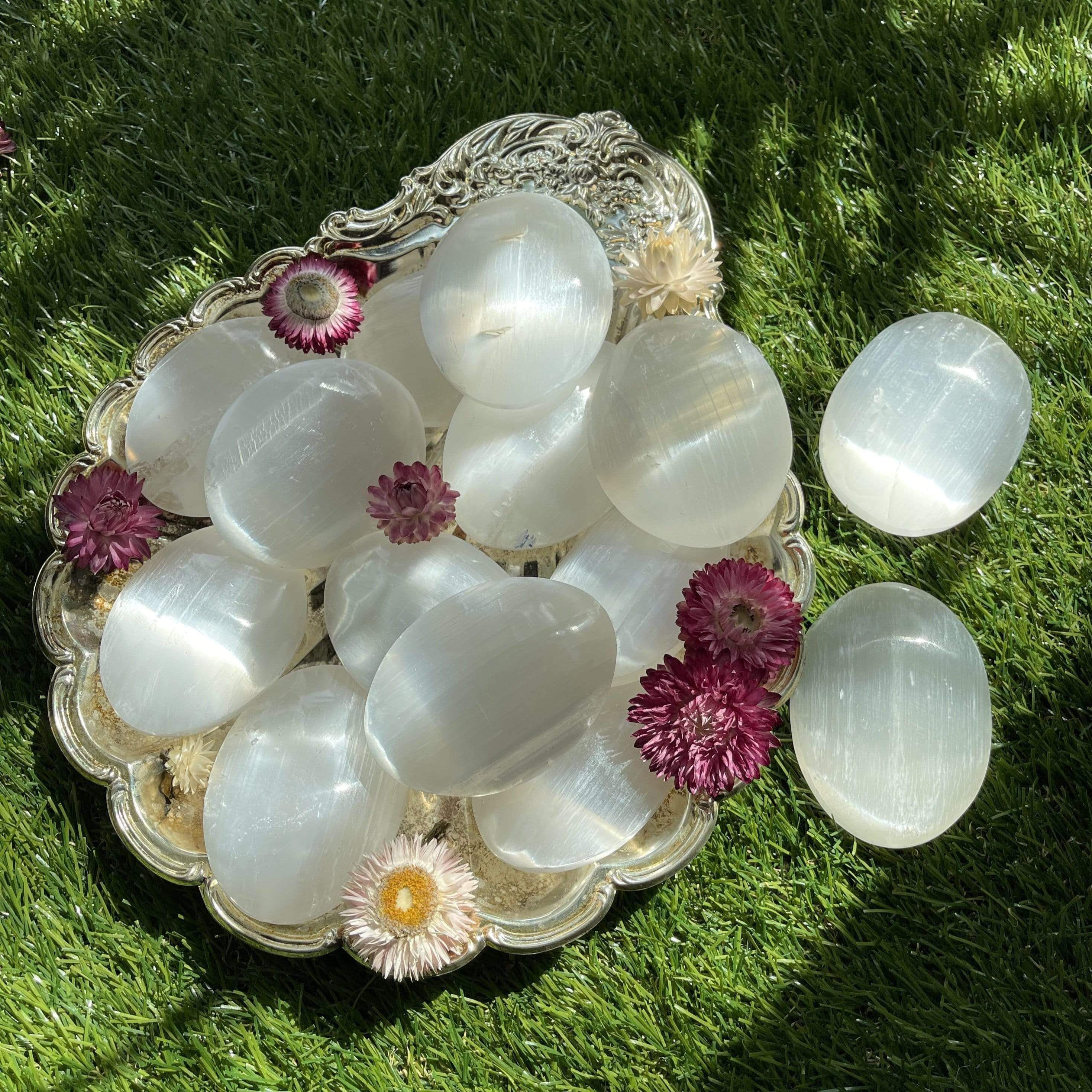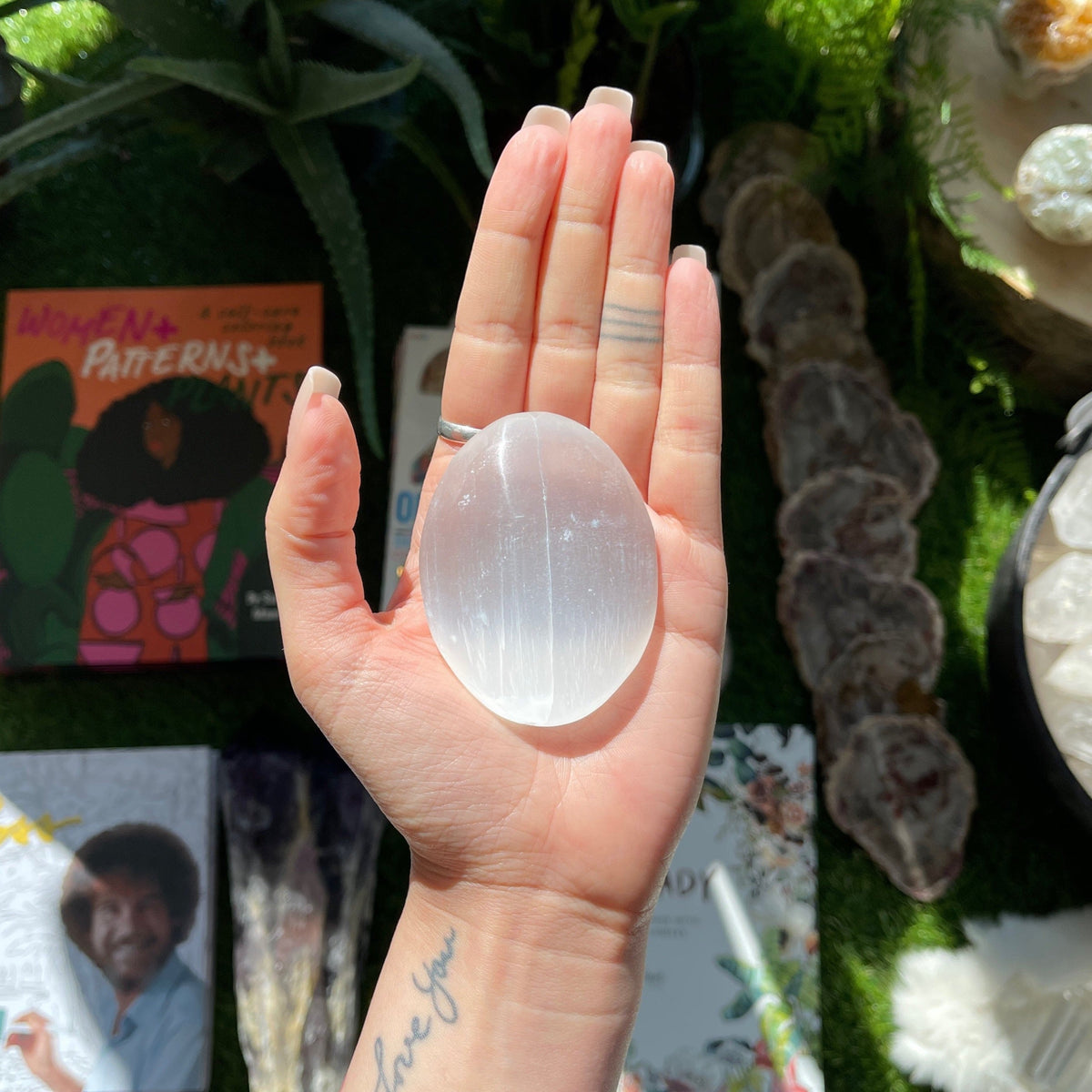 Pretty palm-sized polished selenite. These will vary in size and shape (that's the beauty of the natural world) and you will receive one similar to the one(s) shown.