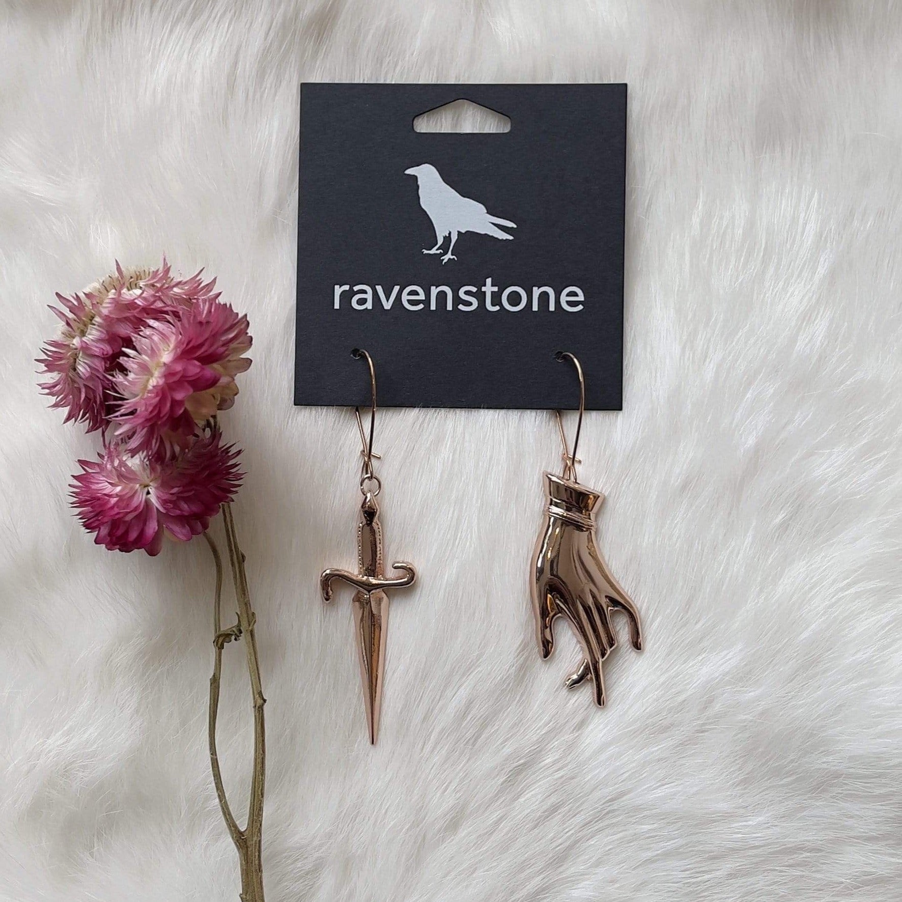 Recycled brass (hand) and hand-poured pewter (dagger) finished with shiny, genuine rose gold and suspended on secure "kidney" style ear wires.