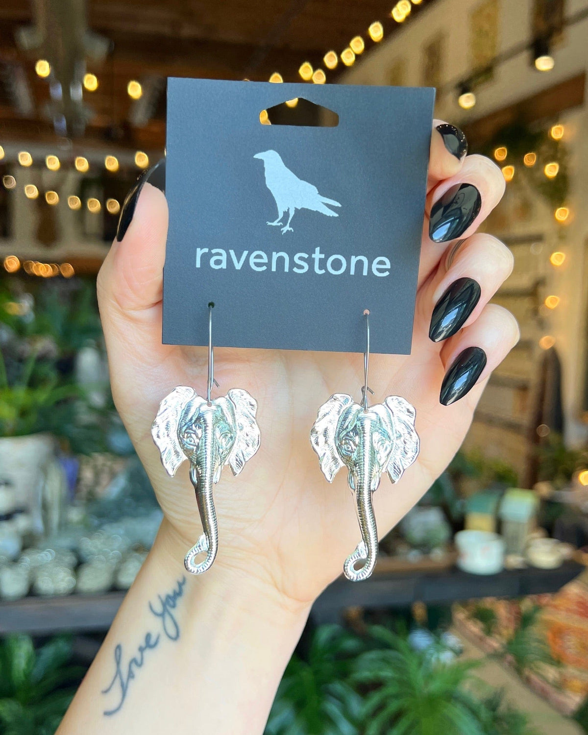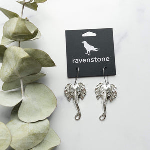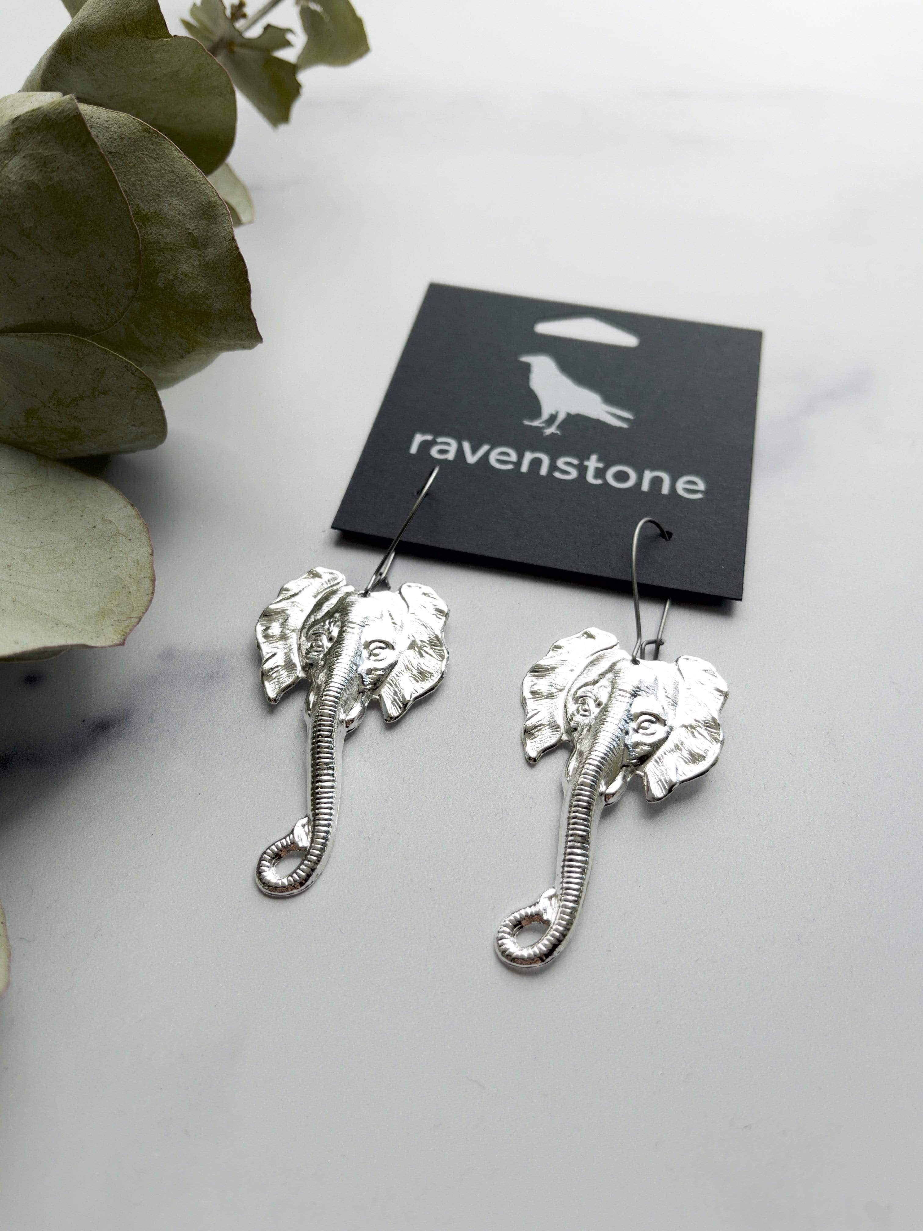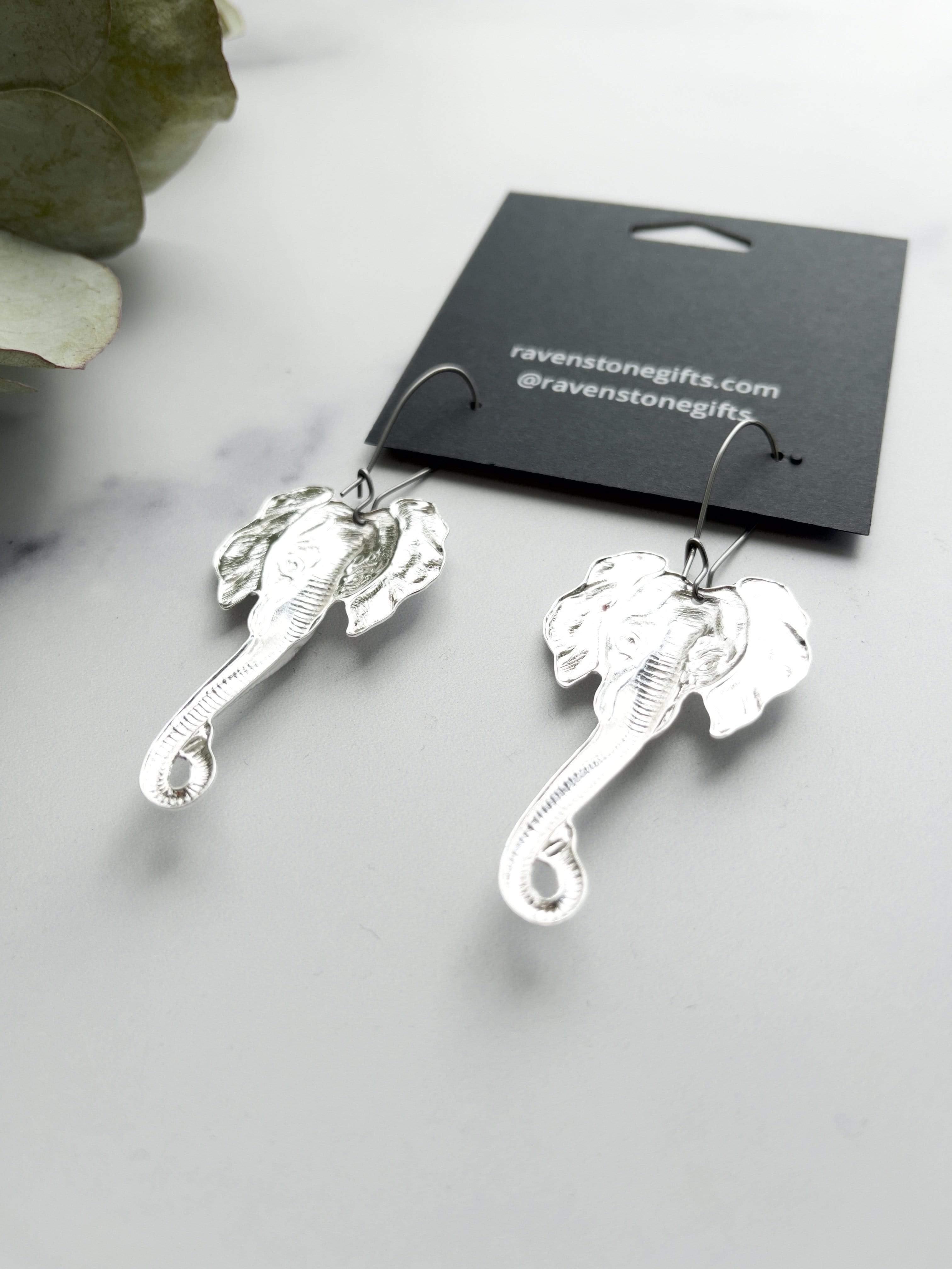 Large, lightweight (hollow backed) metal elephant head earrings.