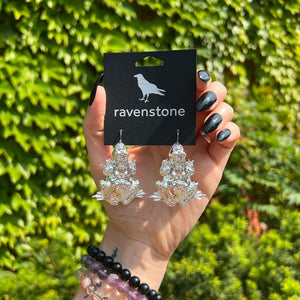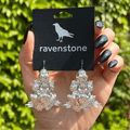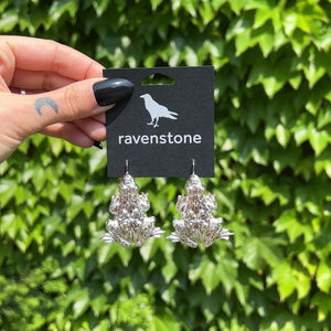 Recycled brass finished in genuine, shiny silver and suspended on dainty stainless steel “fish hook” style wires.